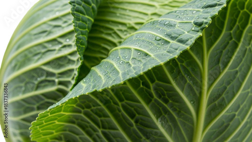 Fresh green cabbage leaves with water droplets create vibrant and healthy appearance, showcasing natural texture and color of vegetable