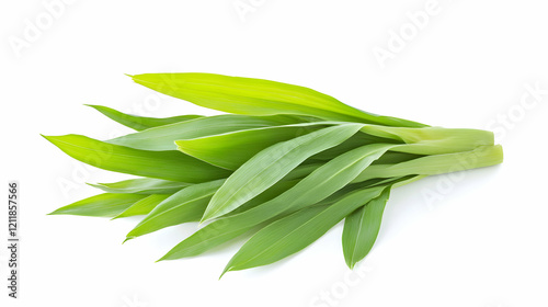 Fresh green galangal leaves isolated on white background; ideal for cooking and herbal medicine
