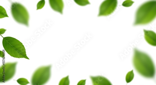 Fresh green leaves frame on white background, creating a natural and vibrant border