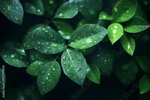 Fresh green leaves with natural light and soft dewdrops