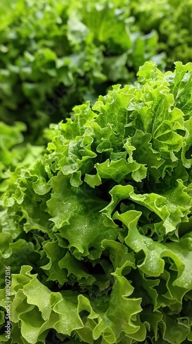 Fresh green lettuce leaves densely packed, perfect for salads or garnishes in a vibrant kitchen