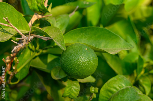 fresh green oranges on tree