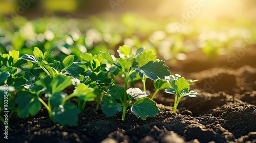 Fresh green parsley growing abundantly in garden beds, with sunlight filtering through, highlighting its crisp leaves in selective focus.