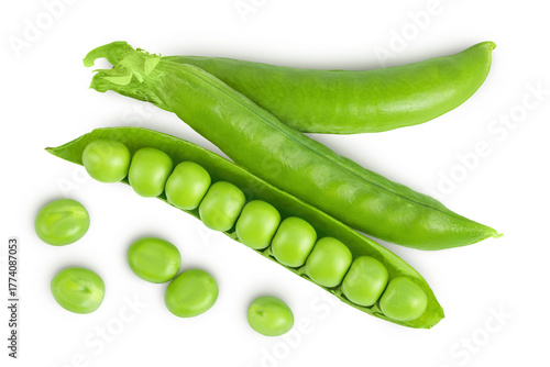 Fresh green pea pod with beans isolated on white background. Top view. Flat lay