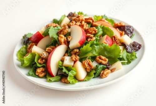 Fresh greens, juicy apples, crispy celery, and creamy walnuts arranged on a white plate