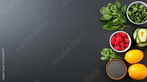 spinach, raspberry, lemon, avocado, bowl, fruit, vegetable, ingredient, healthy, food, seed, leaf, berry, plant, diet, fresh, nourishment, raw, isolated, background, dark, green, red, yellow, slice, organic, natural, top, view, arrangement, clean, space, copy, minimalist, concept, design, overhead, wellness, colours, texture, composition, lifestyle, produce, antioxidant, vegetarian