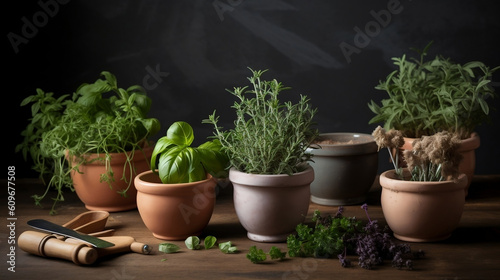 Fresh Herb Plants, Rosemary, Thyme, Basil, Mint, Oregano Plants image generated by Creative AI