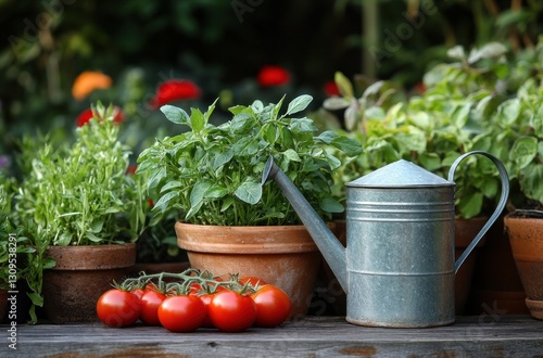 Fresh herbs and ripe tomatoes with a vintage watering can in a vibrant garden setting surrounded by colorful flowers and lush greenery