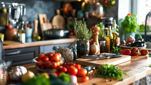 kitchen, vegetable, tomatoes, herb, onion, garlic, olive oil, countertop, chopping board, cooking, preparation, culinary, fresh produce, meal, healthy, food, seasoning, favor, nourishment, kitchen utensile, ambience, lifestyle, rustic, organic, receipe, vibrant, arrangement, natural light, epicure, cleanliness, chef, hand, dish, garden, dining, texture, colours, equipment, culinary arts, inspiration, freshness, delicious