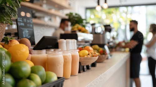 Fresh Juice Bar with Healthy Drinks and Fresh Fruits Displayed