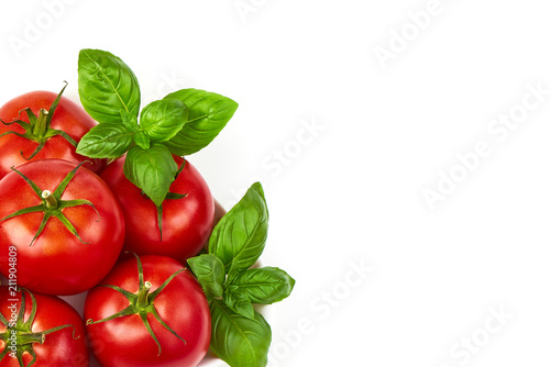 Fresh juicy tomatoes with basil leaf, isolated on white background. Close-up.