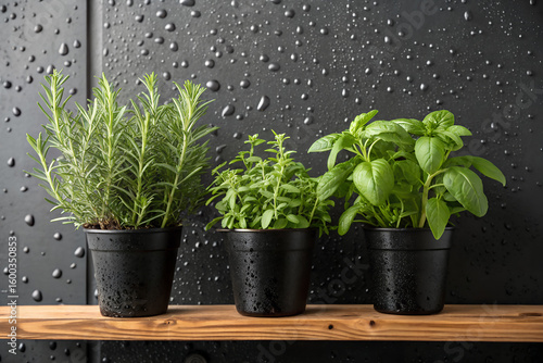 Fresh Kitchen Herbs in Black Pots on Wooden Shelf with Water Droplets Background