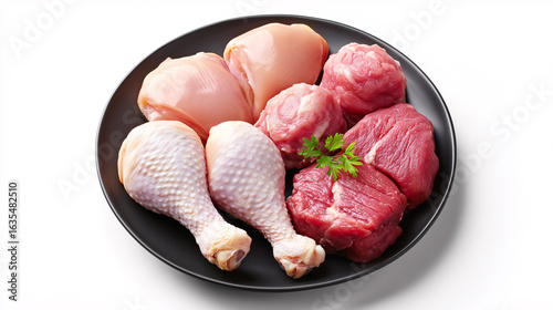 Fresh Meat Cuts on a Plate: A visual feast showcasing an array of fresh, uncooked meat cuts, artfully arranged on a sleek, dark plate, ready for culinary exploration.