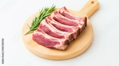 Fresh meat ribs garnished with rosemary on a wooden cutting board, white isolate background.
