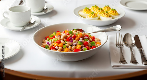Fresh Mediterranean Bean Salad Served in a Classic White Bowl at a Restaurant