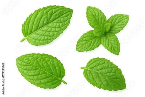Fresh mint leaves displaying bright green hue, transparent backdrop enabling seamless graphic design incorporation