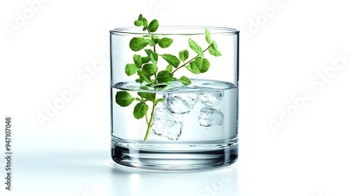 Fresh Mint Leaves in Glass of Water with Ice Cubes