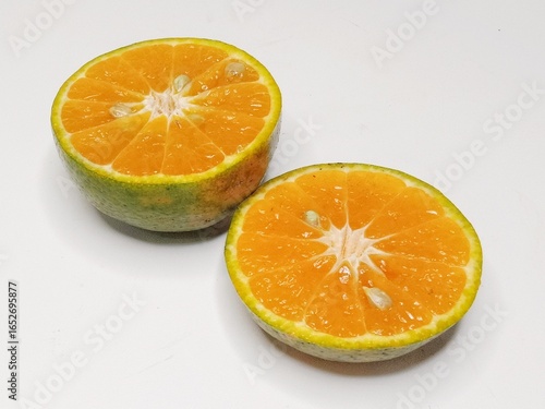 Fresh orange fruit cut in half, isolated on white background. Citrus photography, healthy tropical fruit, vitamin C, natural food, diet and nutrition concept.