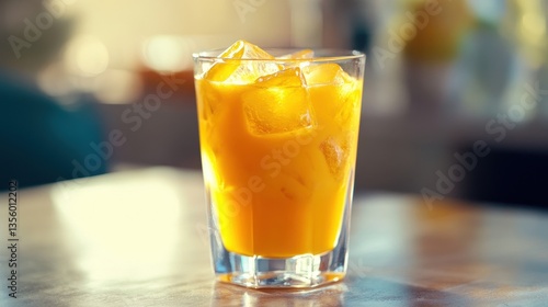 Fresh Orange Juice in Clear Glass with Ice Cubes on Table