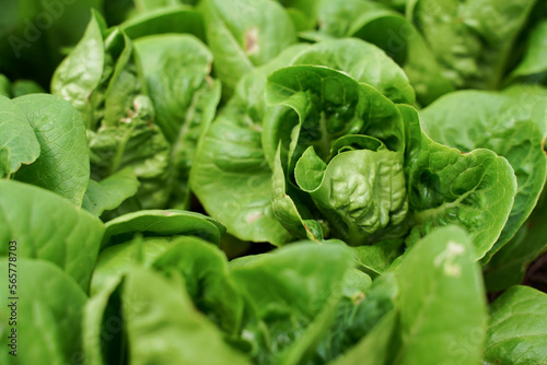 Fresh organic green cos lettuce growing on a natural farm. Photosynthesis salad vegetables growth on the soil in the plantation.
