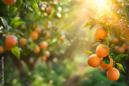 Fresh organic oranges hanging on trees in a beautiful sun-drenched orchard