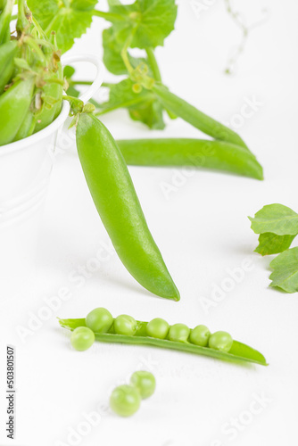 Fresh organic raw green peas pods in a bowl and plants leaves on white background. Healthy eating, vegan and vegetarian legume food, raw food and detox super food, bean protein, close up