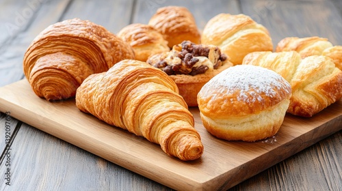 Fresh pastries - croissants, buns, muffins on a wooden board