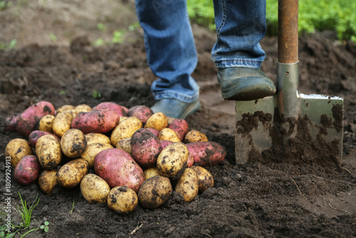 Fresh potato harvest on soil ground close up. Farmer legs with shovel harvesting, digging up organic potatoes in garden