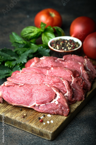Fresh raw beef, cut into steaks with vegetables, herbs and spices on a wooden board on a dark background.