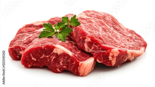 Fresh Raw Beef Cuts with Green Parsley on a White Background