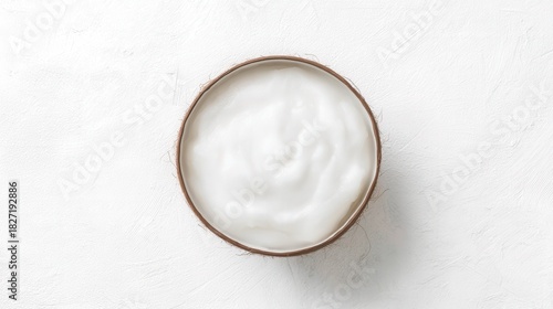Fresh Raw Coconut Cream in a Coconut Shell Bowl Top View. Generative AI