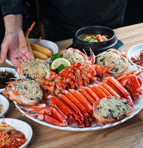 crab, seafood, fresh, steamed, cooked, boiled, delicious, food, ingredient, dish, plate, eatery, market, fishmarket, korea, korean food, asian cuisine, epicure, luxury, red, orange, shell, crustacean, claw, leg, dinner, lunch, meal, freshness, healthy, protein, catch, ocean, sea, isolated, white background, topview, closeup