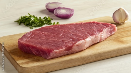 Fresh Raw Meat Cut on Wooden Board with Red Onion and Garlic Clove in Kitchen Setting Surrounded by Herbs and Ingredients Ready for Cooking