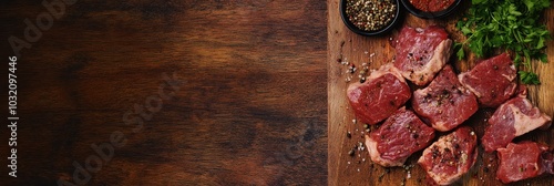 Fresh raw meat cuts arranged on a rustic wooden surface, perfect for cooking and grilling inspiration.
