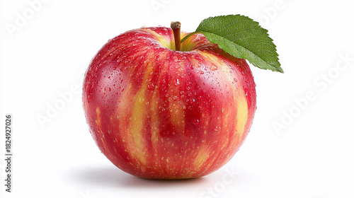 Fresh red apple with droplets and a green leaf on a white background