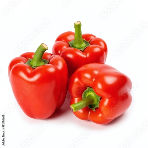 Fresh red bell peppers stacked on a white background showcasing their vibrant color and crisp texture