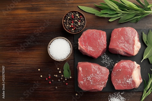 Fresh Red Meat Cuts with Spices and Herbs on Wooden Table