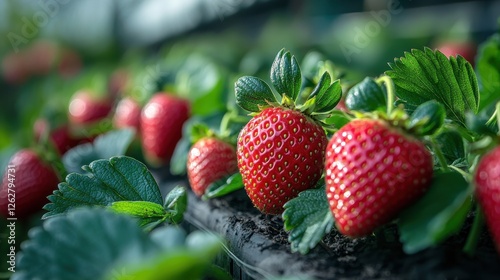Fresh, ripe strawberries growing on green leaves in a vibrant agricultural setting.