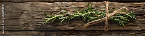 Fresh Rosemary Sprig Tied with Twine on Rustic Wooden Surface