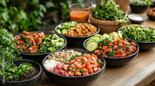 Fresh salad bowls with vibrant vegetables and herbs Generative Ai