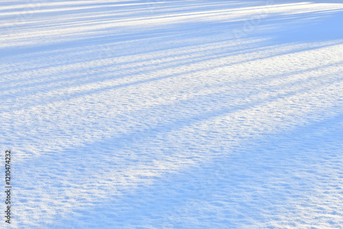 Fresh sparkling snow close-up, diagonal shadows on the snow on a flat surface perfect as a winter season background texture