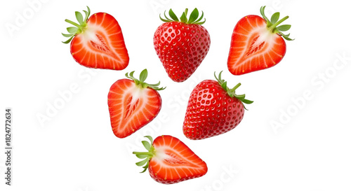 strawberry, fruit, fresh, red, whole, sliced, seed, green leaf, food, healthy, natural, organic, sweet, juicy, summer, harvest, ingredient, dessert, snack, vitamin, nourishment, vibrant, colours, isolated, produce
