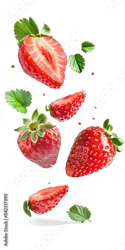 strawberry, fruit, fresh, floating, leaf, red, green, healthy, food, fruit, diet, concept, summer, vibrant, organic, natural, nourishment, snack, vitamin, juicy, appetising, background, delicious, sweet, tasty, light, clean, minimalist, simple, decorative, isolated, creative, refreshing, dietary, wellness, botanical, design, nature, ai