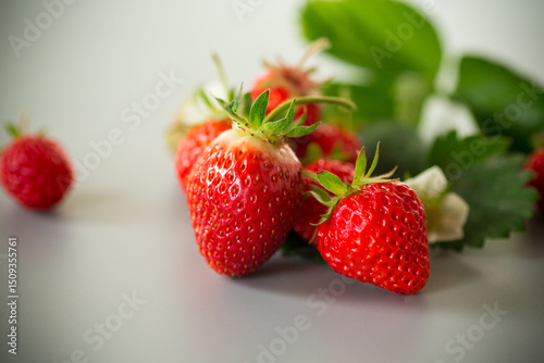 Fresh strawberries of juicy red color on a minimalistic background
