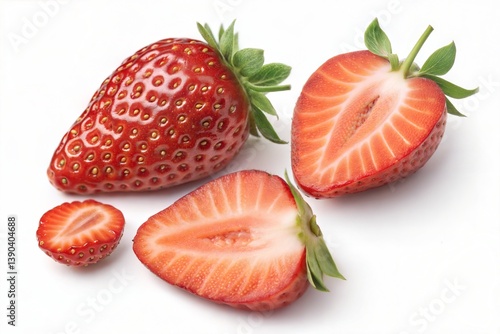 strawberry, fruit, food, fresh, whole, sliced, white, isolated, red, healthy, ripe, sweet, juicy, berry, cut, half, green, leaf, macro, closeup, organic, diet, dessert, background, set, summer, vitamin, natural, delicious