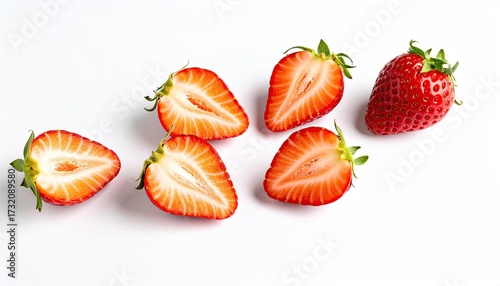strawberry, fruit, red, fresh, healthy, food, half, slice, juicy, vibrant, ripe, sweet, delicious, vitamin, natural, organic, summer, summer, closeup, top, view, isolated, white, background, whole, piece, nature, nourishment, produce, redness, freshness, edible