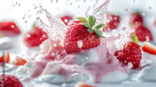 Fresh strawberry splashing into creamy yoghurt isolated on white background.