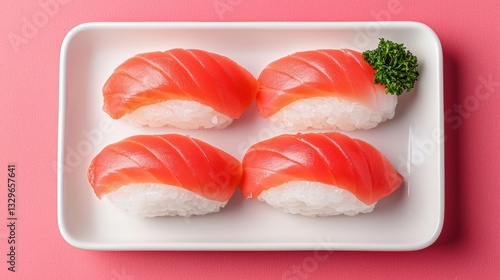 sushi, seafood, japanese, rice, salmon, fish, raw, plate, dish, cookery, food, delicious, healthy, fresh, epicure, snack, meal, pink, red, white, green, colours, presentation, minimalist, simple, elegant, studio, background, still life, texture, pattern, closeup, detail, tasteful, refined, aesthetic