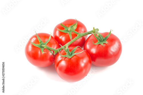Fresh tomatoes with green leaves isolated on white background.