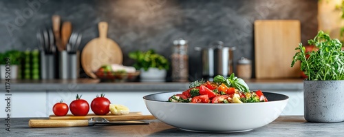 Fresh Vegetable Salad in Modern Kitchen with Cooking Utensils and Herbs in Background